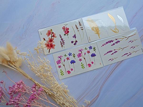 上排左至右:小花組圖B 【S132】、迷你燙金 - 羽毛 【MB08】